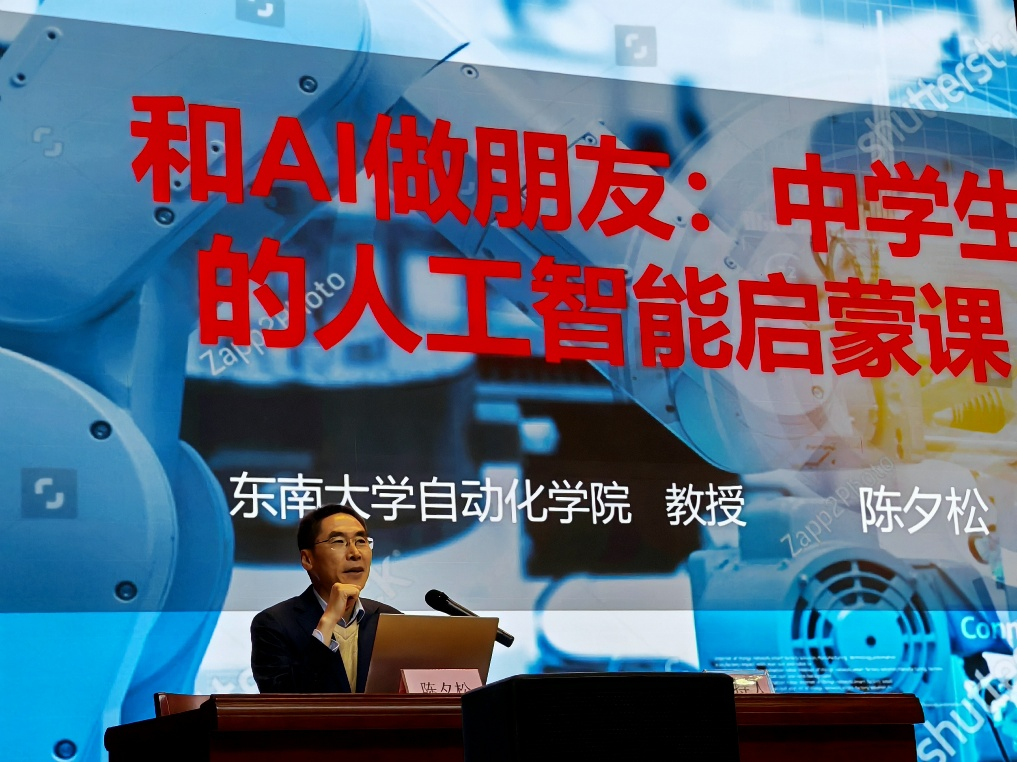 2026年3月30日,江苏省自动化学会普及与咨询工作委员会名誉主任、东南大学自动化学院陈夕松教授应邀走进徐州中学,出席该校2026年“校园科技节”活动,并为师生带来了一场题为“和AI做朋友:中学生的人工智能启蒙课”的精彩科普报告。来自徐州中学高一年级的近900名学生齐聚报告厅,共同参与了本次活动。