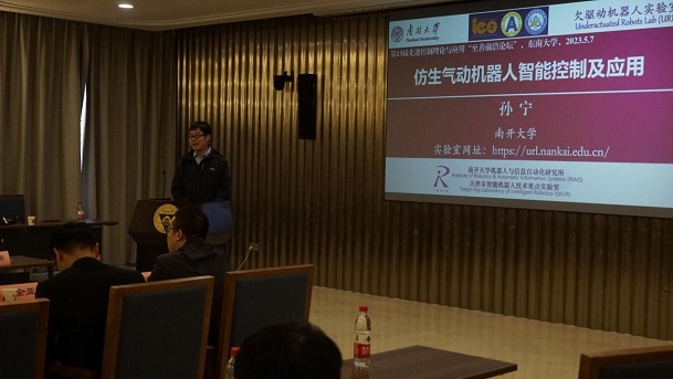在上午的第五场报告中,南开大学孙宁教授作了题为“仿生气动机器人智能控制及应用”的报告。报告围绕气动仿生机器人的建模、规划和控制等方面展开:首先,针对单一气动仿生机器人的多个复杂控制问题,提出了多种性能优越的智能控制方法;其次,对于多气动仿生机器人,提出了准确的动力学建模方法以及多种高性能控制方法;最后,展望了气动仿生机器人未来的研究方向和发展趋势。