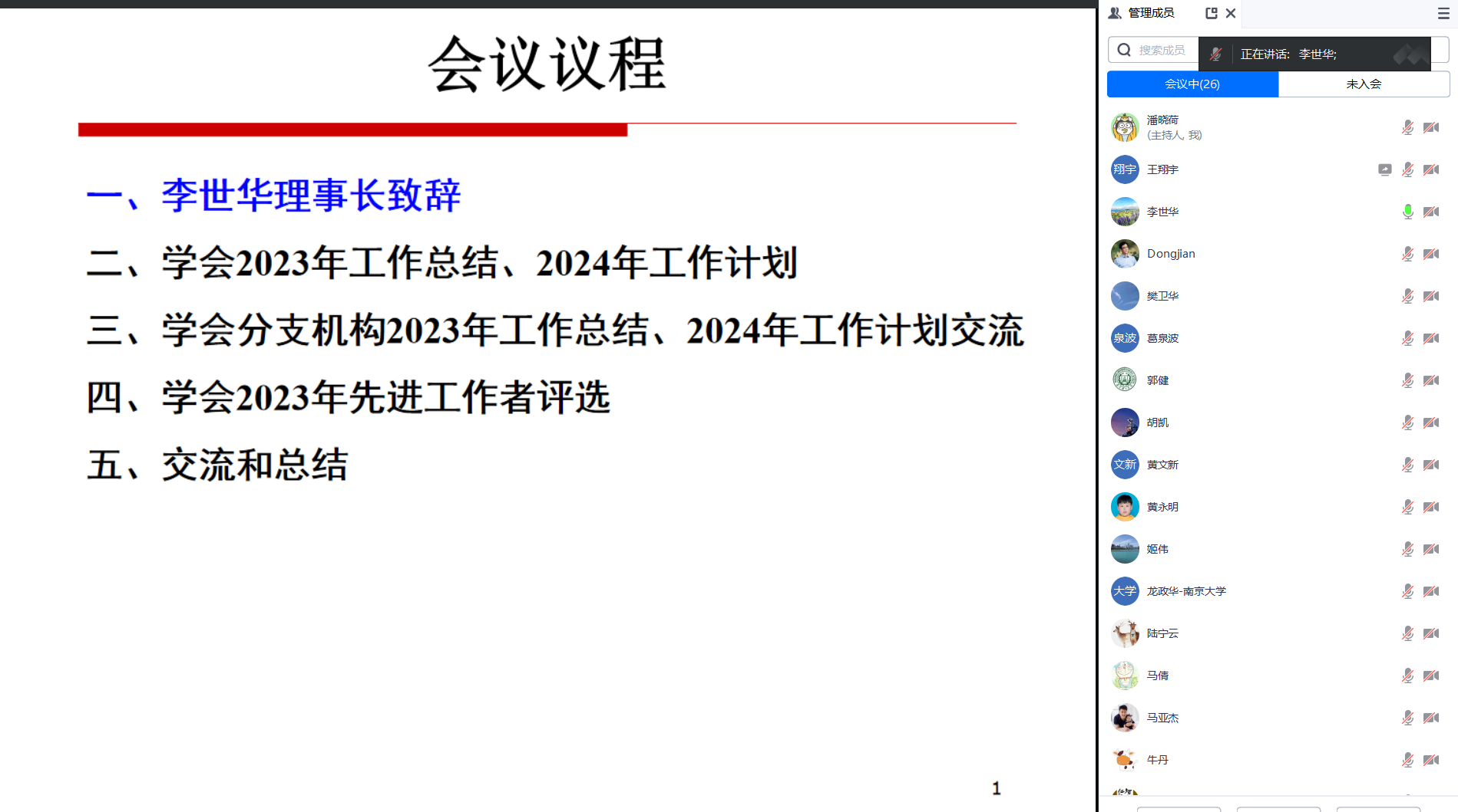 会议第一项议程为学会李世华理事长致辞。他首先向全体参会代表表示热烈欢迎,向各分支机构对学会的支持表示衷心感谢。李世华理事长充分肯定了本年度各分支机构的工作表现,他表示,分支机构要继续加强制度建设,规范开展工作,壮大委员队伍,通过建设高水平分支机构,提升学术引领力,增强委员们的归属感和荣誉感。